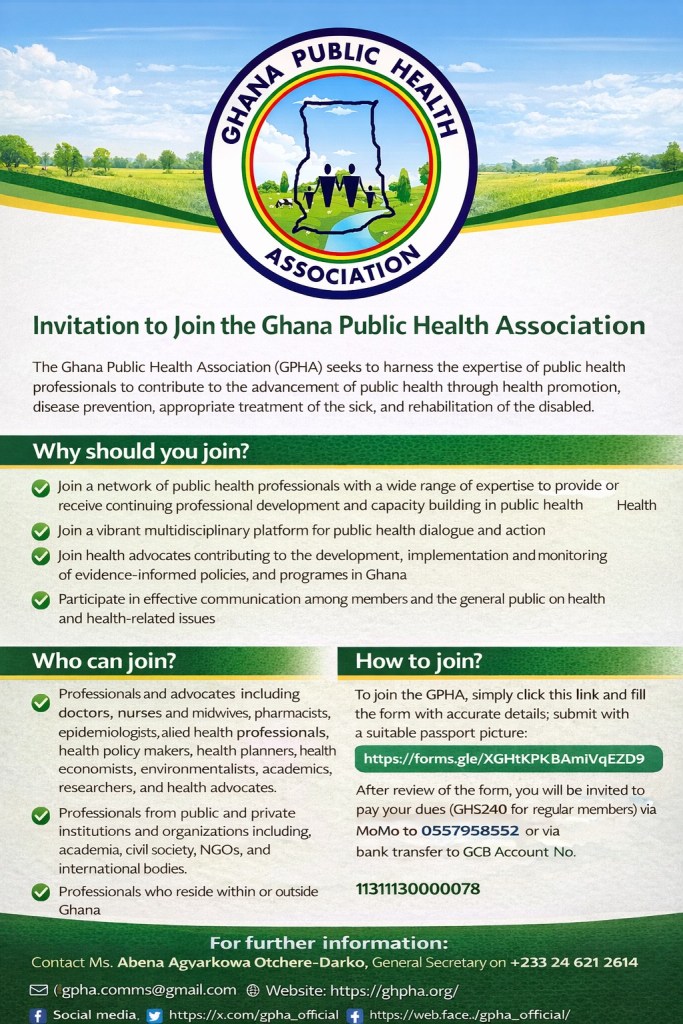 The Ghana Public Health Association seeks to harness the expertise of professionals in the public health fraternity to contribute to the advancement of public health for the promotion of health, prevention of diseases, prompt and appropriate treatment of the sick, and rehabilitation of the disabled. Through our educational seminars, advocacy initiatives and other services, we seek to enlighten the Ghanaian population and key stakeholders on leading public health challenges and